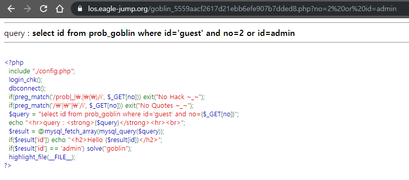 no에 2 or id='admin'을 시도하였으나 따옴표가 필터링되어 exit되었다.