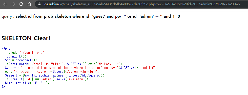 pw에 값을 넣지 않고 id를 admin으로 만들어주는 값(' or id='admin' -- ')을 삽입하여 풀어주면 풀린다.