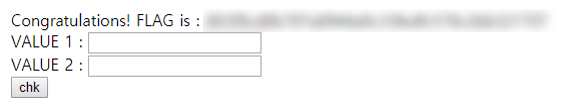 따라서 우리는 VALUE 1에는 알파벳을, VALUE 2에는 숫자를 입력해주어야 하고, 그 두 값의 md5의 해시가 같아야 플래그가 나온다는 사실을 알 수 있다.