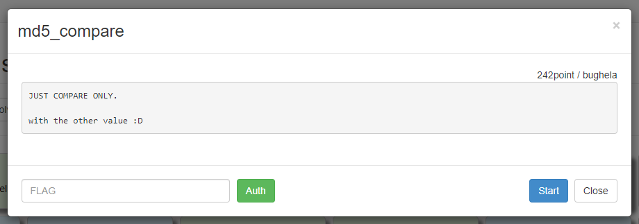 echo "Congratulations! FLAG is : ".auth_code("md5_compare");